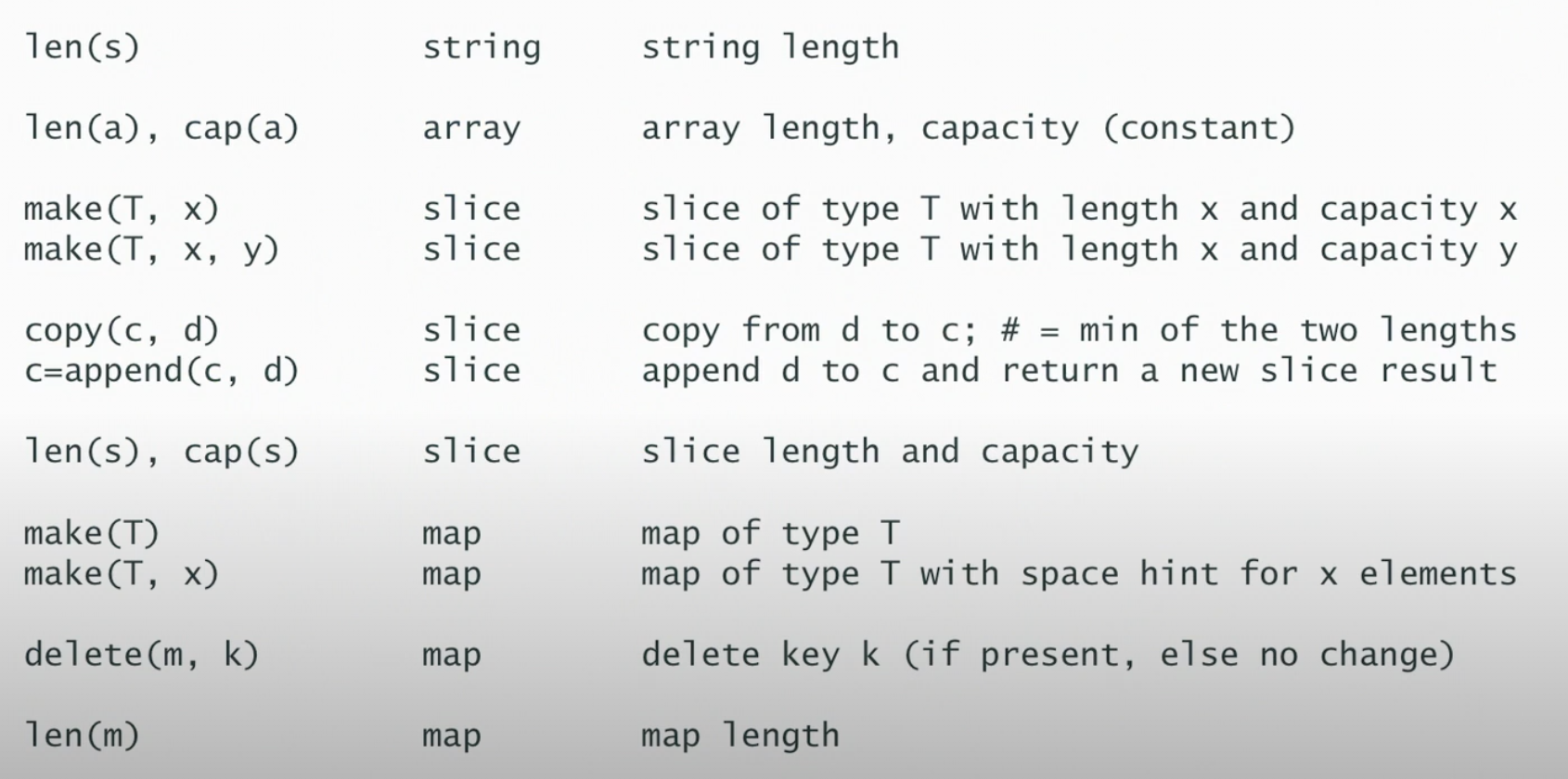 string is the number of UTF-8 bytes required to encode it, NOT THE NUMBER OF LOGICAL CHARACTERSstrings package contains useful string functions==, slices are obviously not. Arrays can be used as map keys, slices cannotcopy and append helper operatorsint you’d get 0)var m map[string]int // nil map (reading any key will return the default value of the map value type)