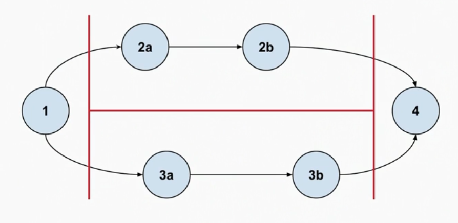 In the example below, there is a partial ordering shown; parts of 2 and 3 have no direct ordering between each other (but they do have an ordering among themselves), however there is an overall requirement that parts 2 and 3 complete before part 4