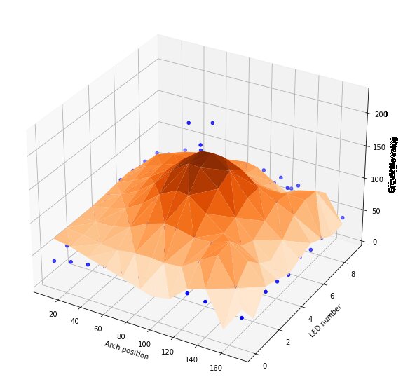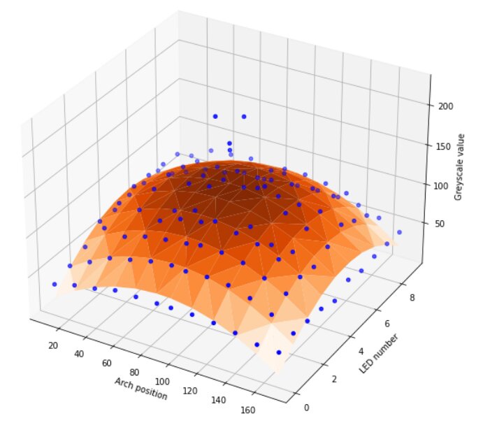 Biquadratic modelling (orange) of pixel response values (blue) as outlined in the original Polynomial Texture Mapping paper