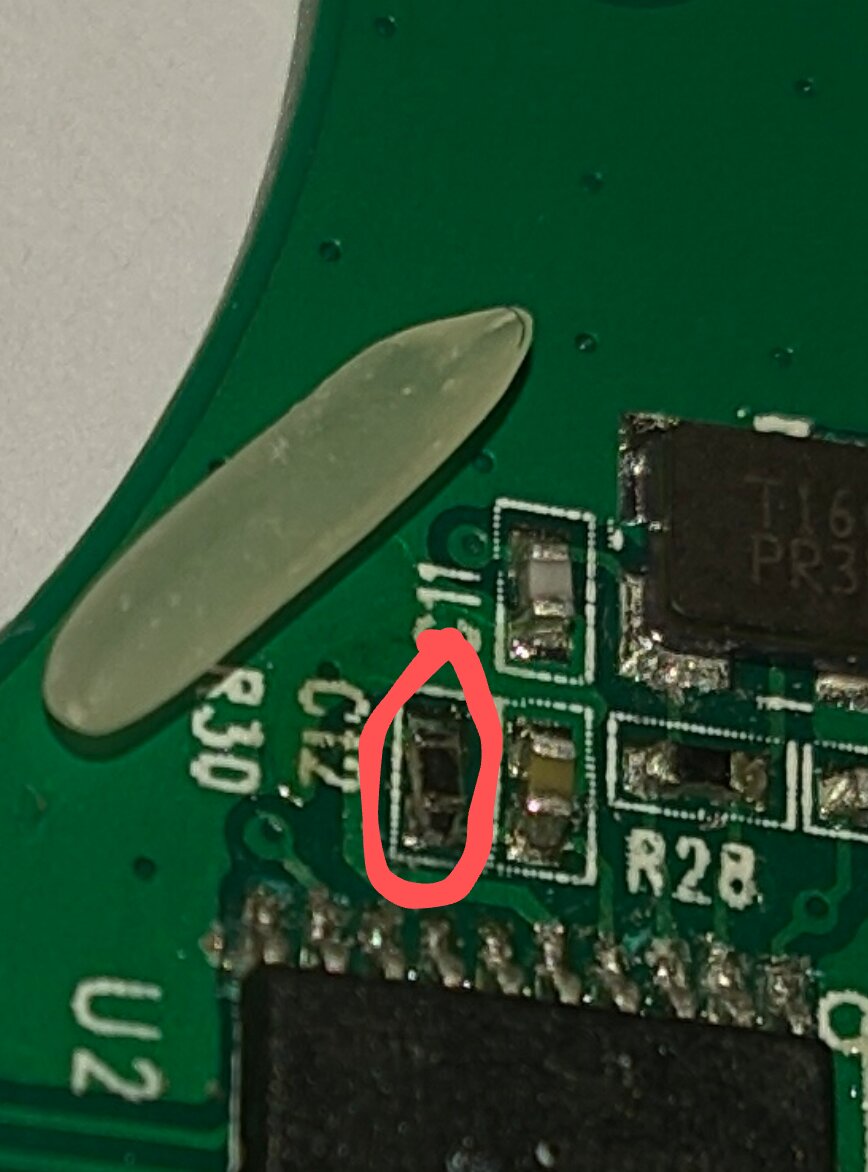 I measured the resistor on the working LDS-006 and it read about 90k, which was the same as on my “development” LDS-006 board. I tried replacing it with a 10k resistor (pictured below with a grain of rice for scale), however the reset was still happening. Below is the logic analyzer trace for the NRST pin, we can see that it is for some reason pulled low periodically (causing the resets). But measuring the other side of the resistor (connected to VCCA), the trace is rock solid. As far as I can currently tell, NRST isn’t connected to anything else, so I can’t quite tell why it is being pulled low. I just decided to short over that resistor to properly keep that pin high.