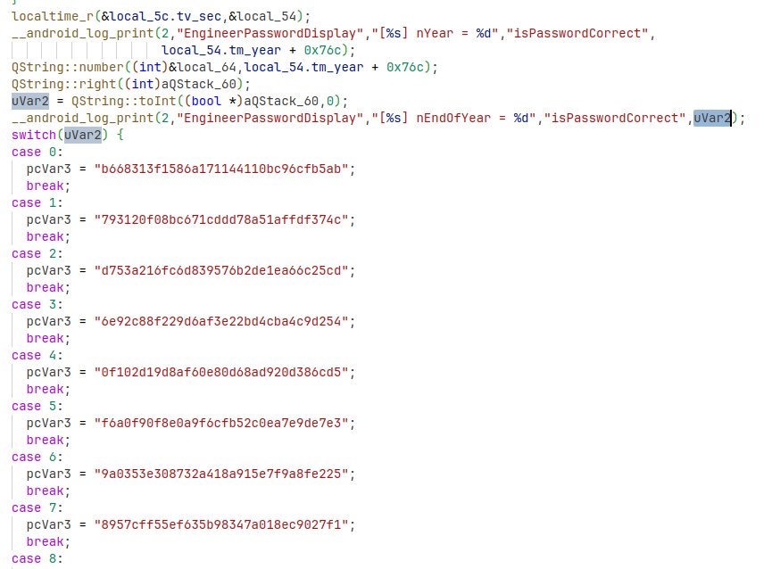 Thanks to some nice debug logging, we uncover the likely area where the password is checked. We can see a set of hashes, and some references to nEndOfYear which confirms some sources online saying the passwords are linked to the system time year. These hashes look like MD5 so it should be easy to crack them with Hashcat, given that we are looking for an 8 digit numeric string. I made a bold assumption that the switch cases correspond to the current year end digit, so I ran the Hashcat command (hashcat -m 0 -a 3 -o output.txt hash.txt ?d?d?d?d?d?d?d?d) against the hash for 2024 and got a crack!