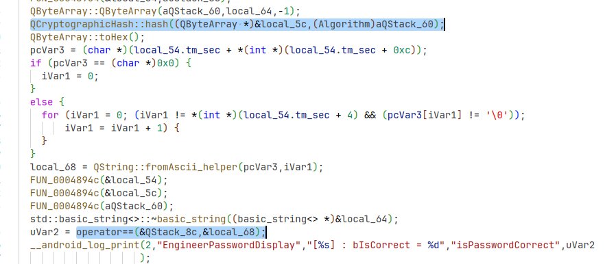 We can see references to EngineerPasswordDisplay which implies that this code is for the engineering mode screen, but I still need access to the variant coding menus. Thankfully the other string reference shown in the Ghidra screenshot above linked to basically identical logic except with a different set of hashes and some logging for VariantPasswordDisplay. I again used the forth hash for 2024 and plugged it into Hashcat, and again got a crack!